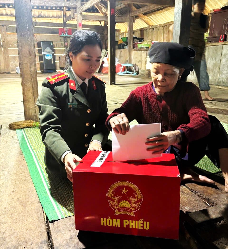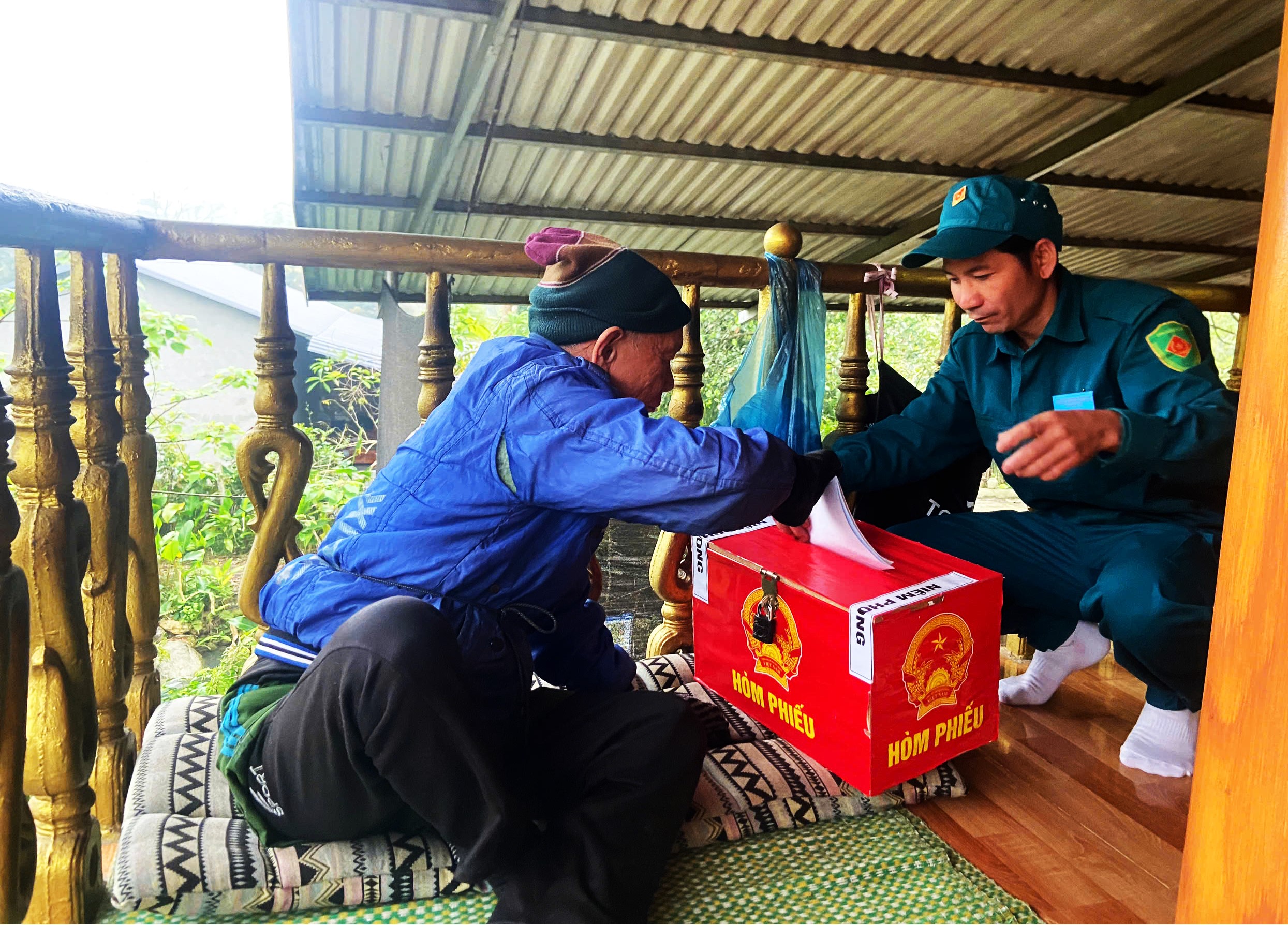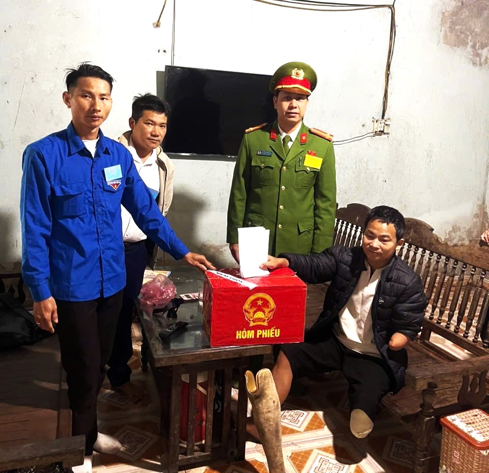 Công an xã phối hợp với các tổ bầu cử mang hòm phiếu phụ đến tận nhà