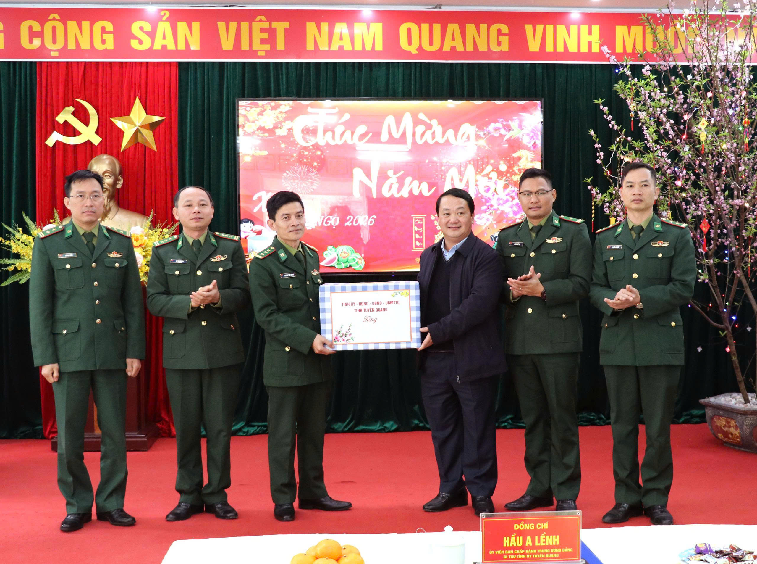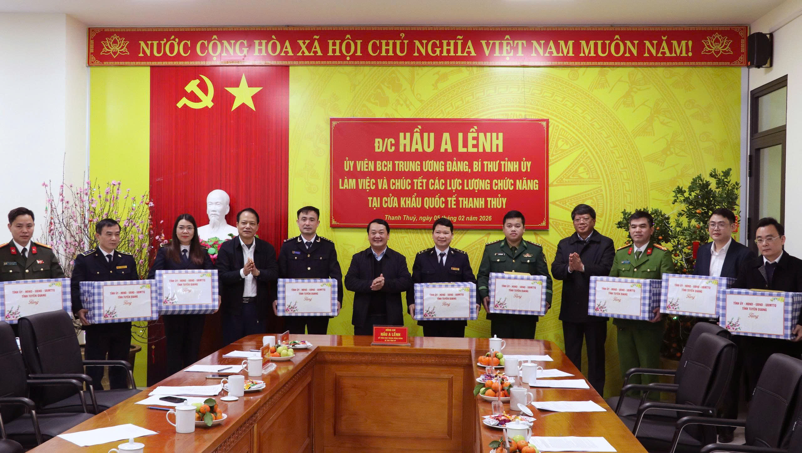 Bí thư Tỉnh ủy Hầu A Lềnh tặng quà, chúc Tết các lực lượng chức năng tại Cửa khẩu Quốc tế Thanh Thủy.