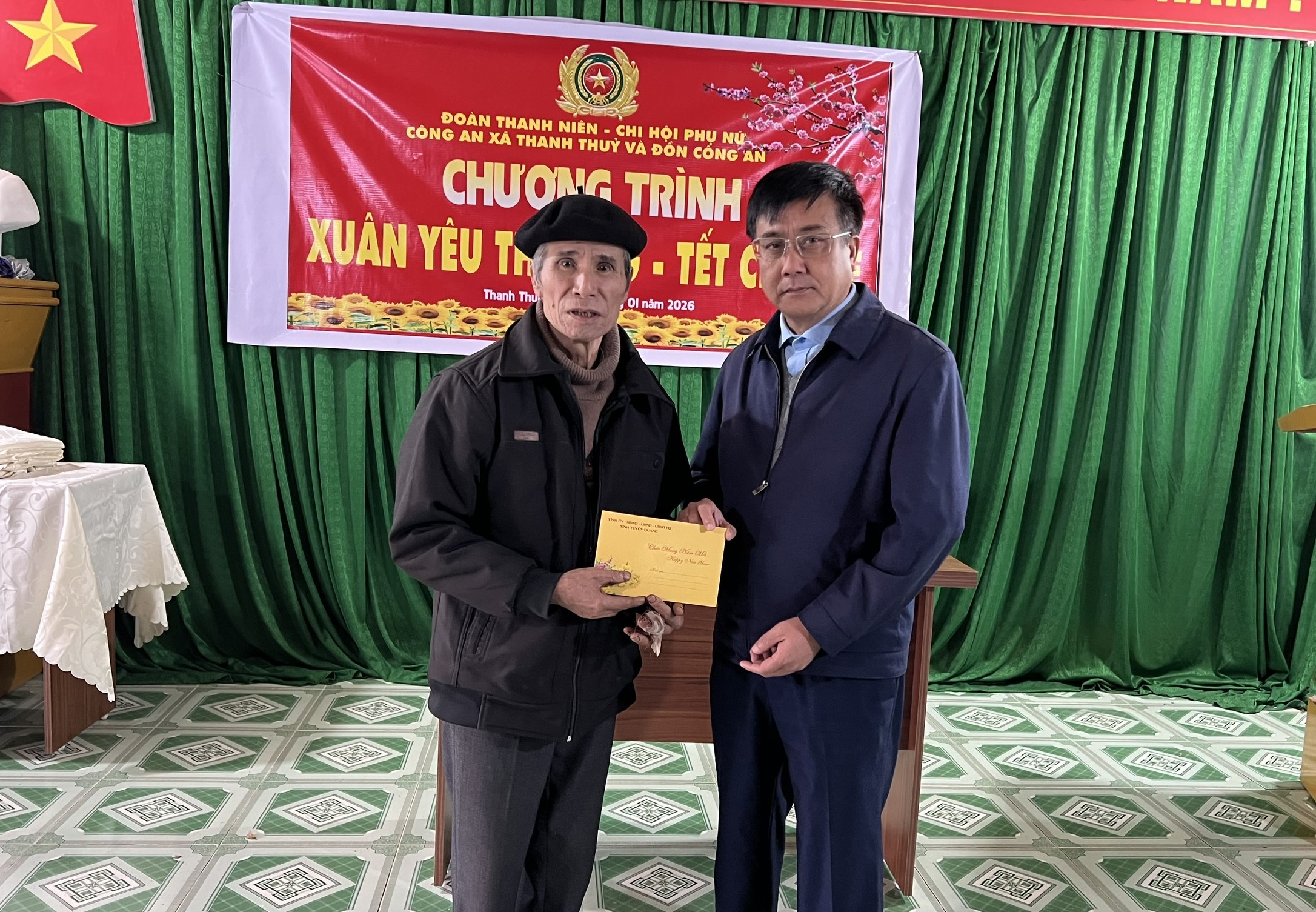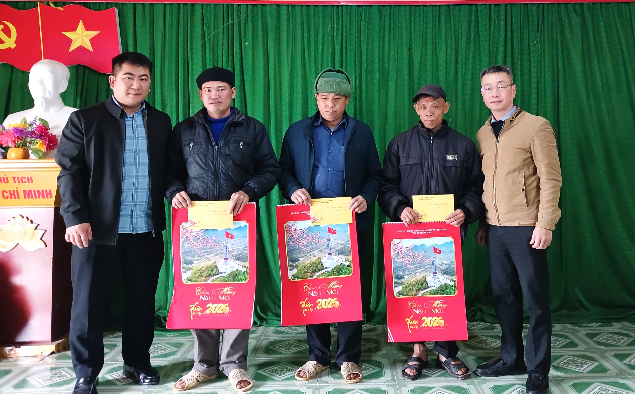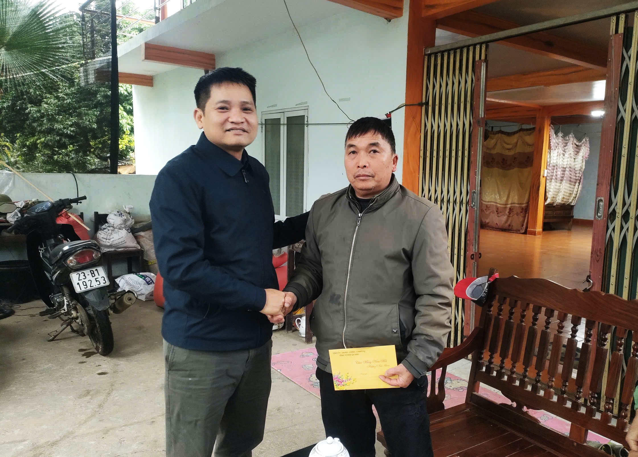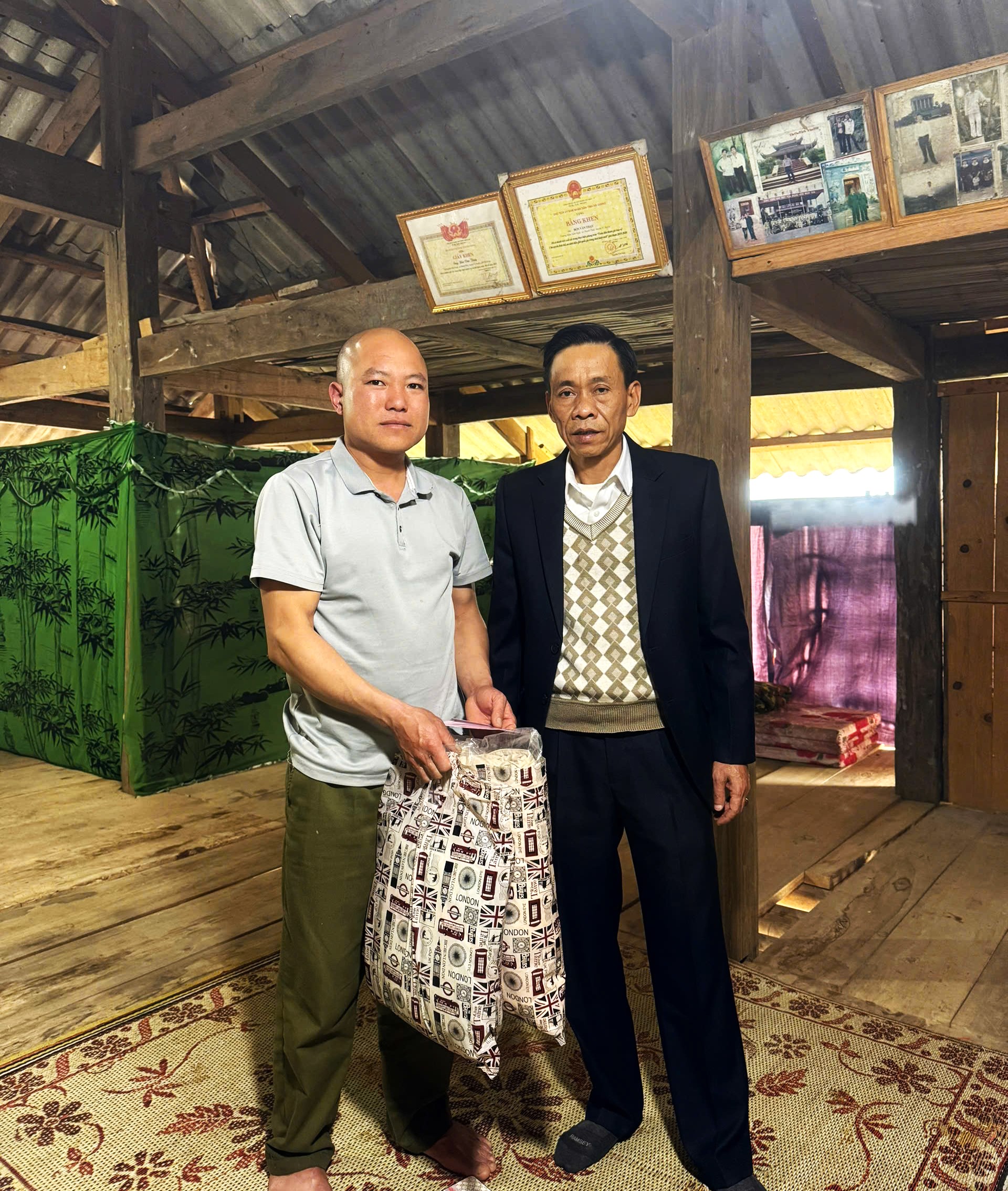 Đồng chí Phùng Viết Vinh Bí thư Đảng ủy-Chủ tịch HĐND xã Tặng quà cho người có công tại thôn Năm Tẹ
