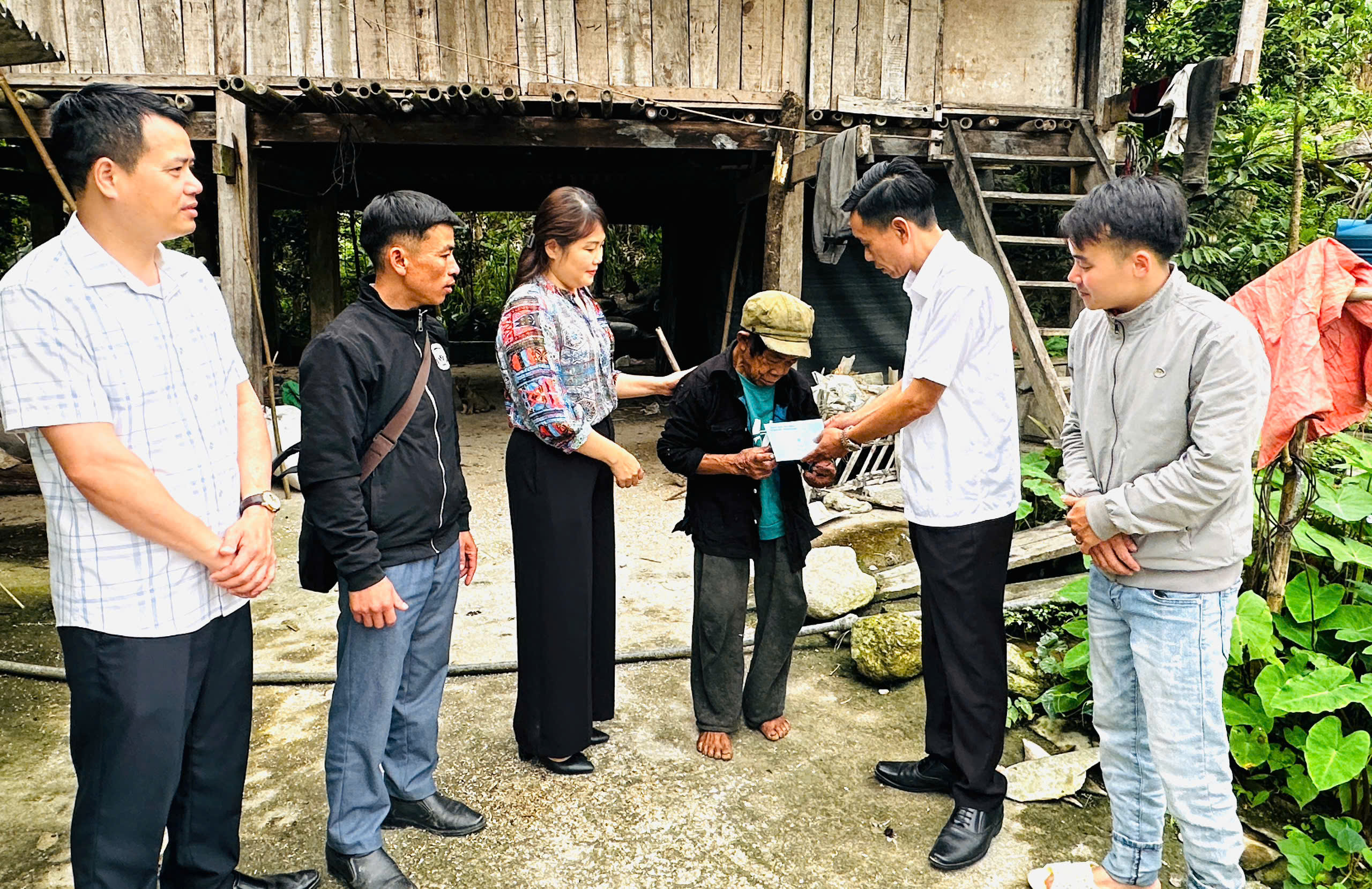 Đồng chí Lê Mạnh Dũng và đồng chí Trịnh Thanh Bình trao quà cho hộ nghèo