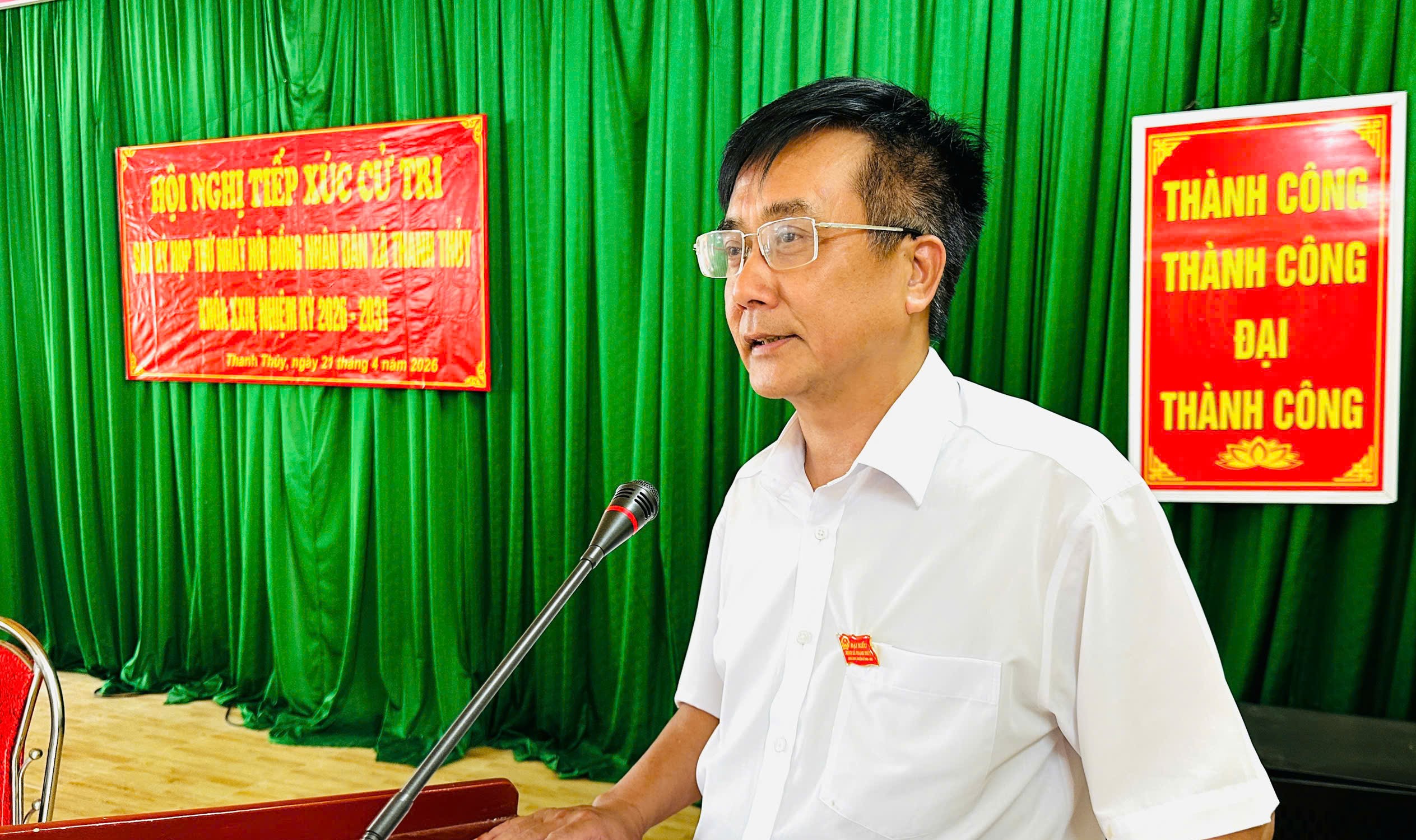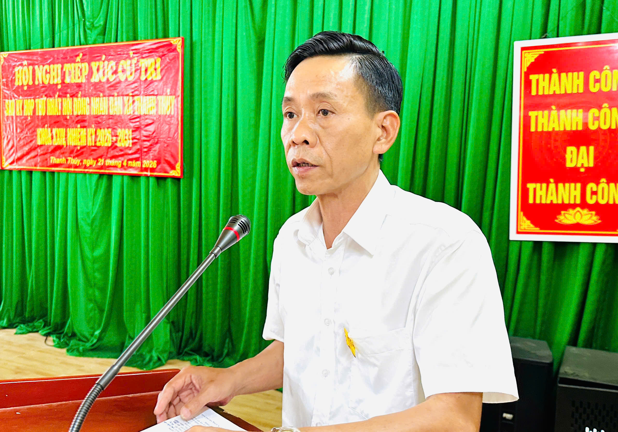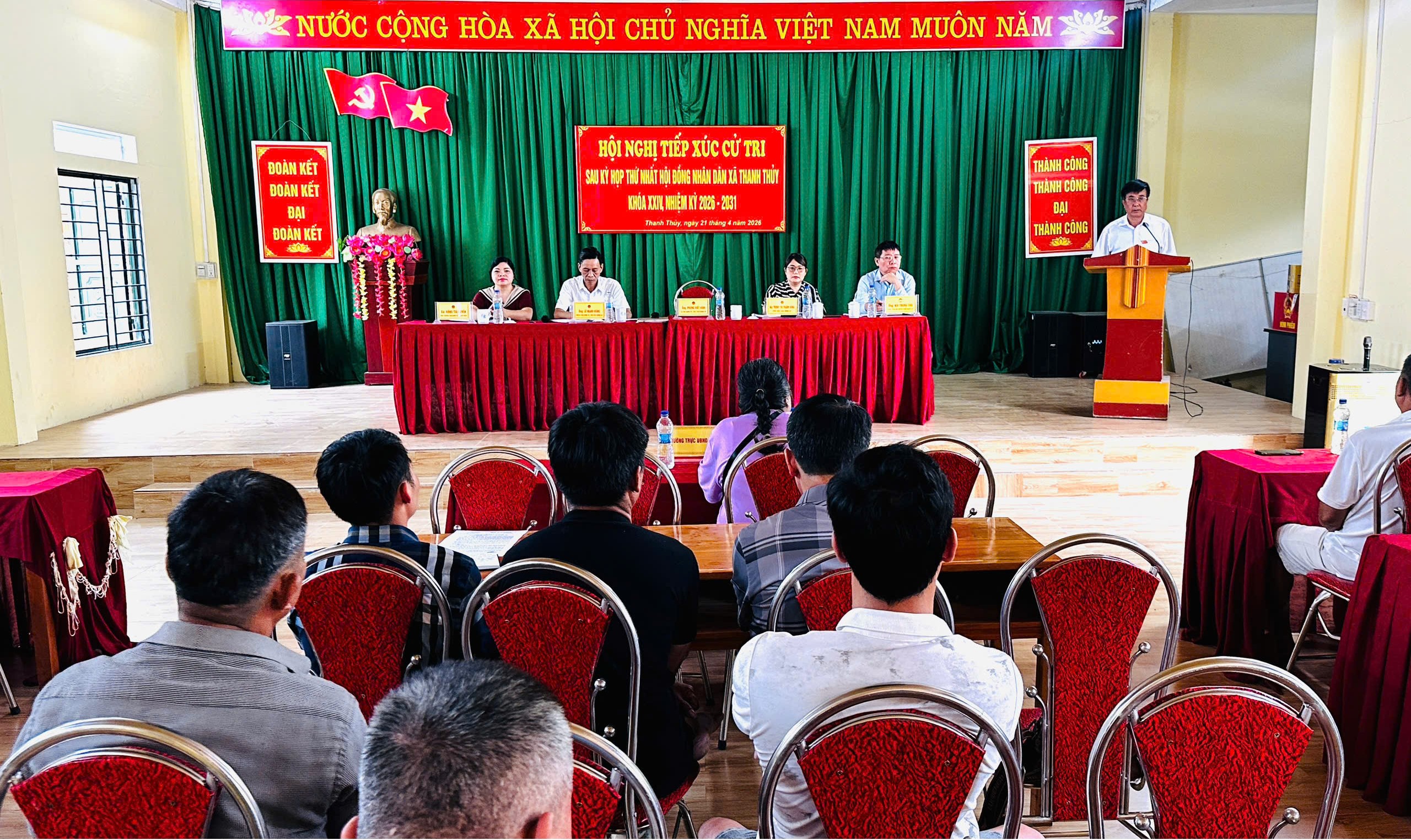 Tại các buổi tiếp xúc với cử tri, Tổ đại biểu HĐND xã đã thông tin tới cử tri về kết quả cuộc bầu cử Đại biểu Quốc hội khóa XVI và đại biểu HĐND các cấp nhiệm kỳ 2026 – 2031. Theo đó, cuộc bầu cử diễn ra dân chủ, đúng luật, an toàn, tiết kiệm; tỷ lệ cử tri tham gia đạt rất cao. Riêng trên địa bàn xã Thanh Thủy, 100% cử tri đã bầu đủ số lượng đại biểu theo quy định, bảo đảm cơ cấu, thành phần và chất lượng, thể hiện tinh thần trách nhiệm và niềm tin của nhân dân đối với Đảng và Nhà nước. Cử tri cũng được nghe báo cáo kết quả Kỳ họp thứ nhất HĐND xã khóa XXIV diễn ra ngày 27/3/2026. Kỳ họp đã kiện toàn các chức danh chủ chốt của HĐND và UBND xã với sự thống nhất cao, bảo đảm đúng quy trình, quy định pháp luật. Việc kiện toàn bộ máy được đánh giá là tạo nền tảng quan trọng để chính quyền địa phương hoạt động hiệu lực, hiệu quả trong nhiệm kỳ mới. Bên cạnh đó, hội nghị cũng thông tin tới cử tri về tình hình phát triển KT - VH - XH, quốc phòng, an ninh biên giới quý I năm 2026 của xã, đồng thời định hướng một số nhiệm vụ trọng tâm trong thời gian tới; dự kiến nội dung, chương trình Kỳ họp thứ hai HĐND xã.